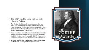 I am very humbled to announce that The Scott Boys has been selected to the long list for the CIBA Goethe Awards. The Goethe Book Awards recognize emerging new talent and outstanding works in the genre of Post-1750s Historical Fiction. The Goethe Awards is a genre division of Chanticleer International Book Awards and Novel Competitions (The CIBAs). Now to see if we make it to the short list!